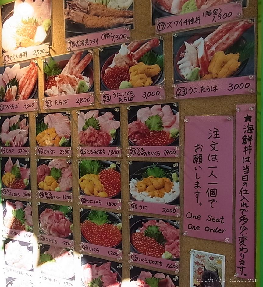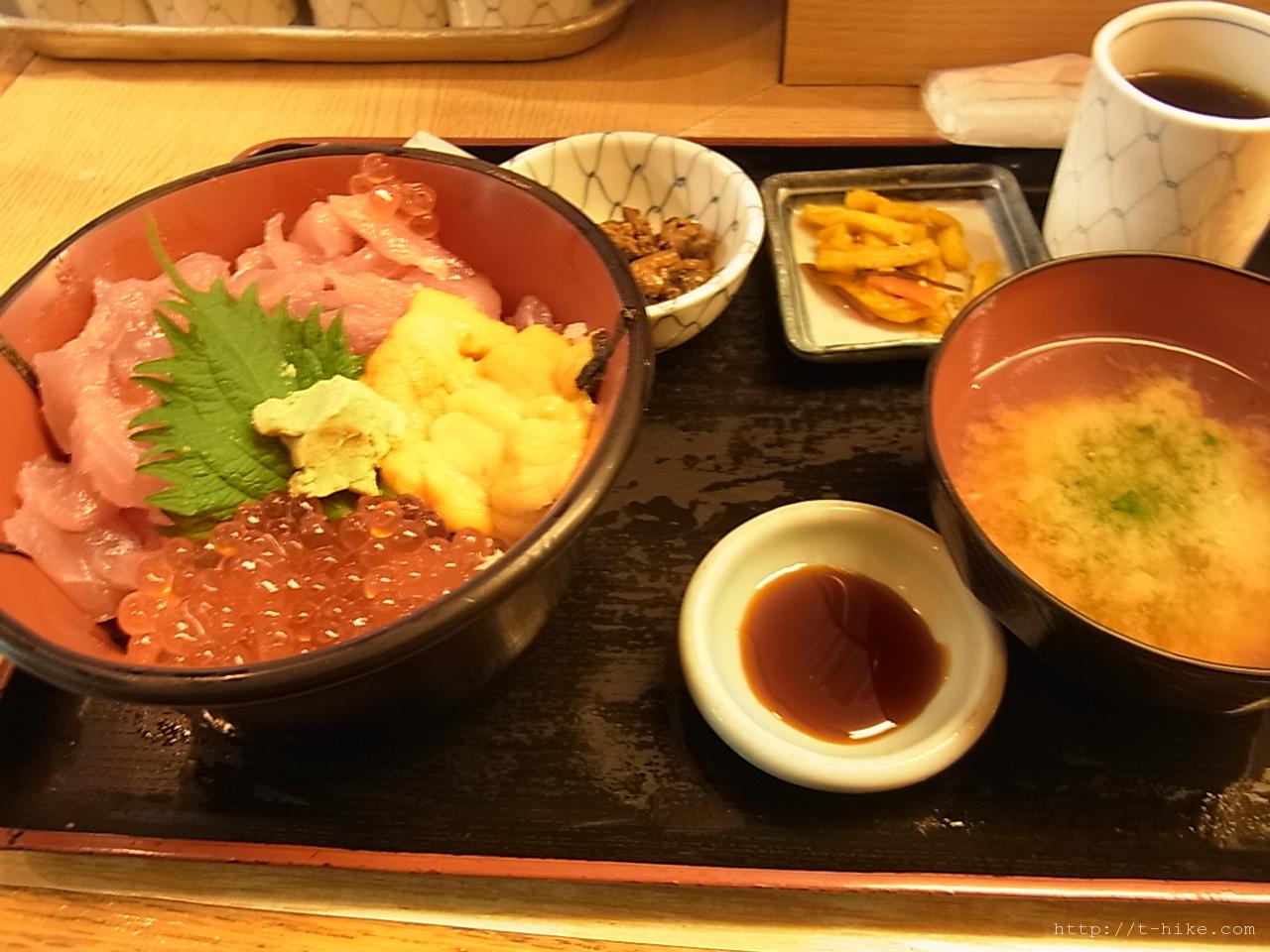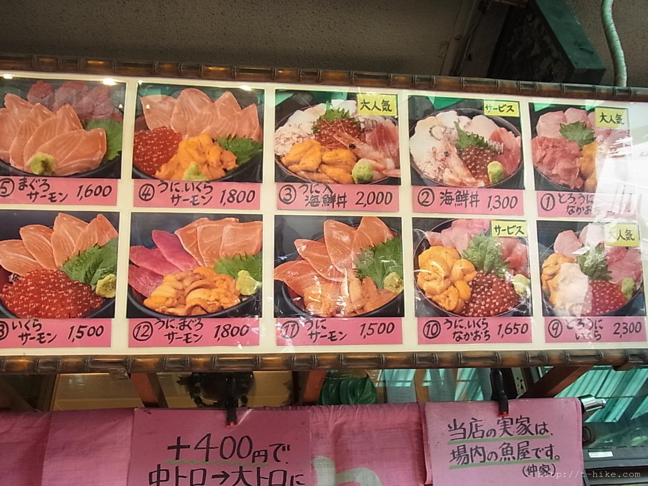 というわけで、私たちは運よく30分ほど並んでお店の席に座れました。頼んだのは10番です。なかおち、うに、いくらの丼で1650円くらいです。当初、ガイドブック(3年前位の発行)には1000円の海鮮丼とありましたが、推定同じものは1300円でした。