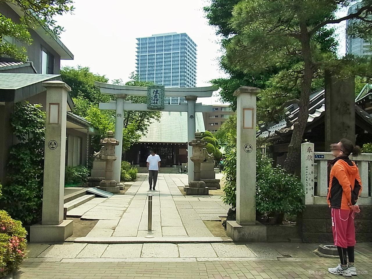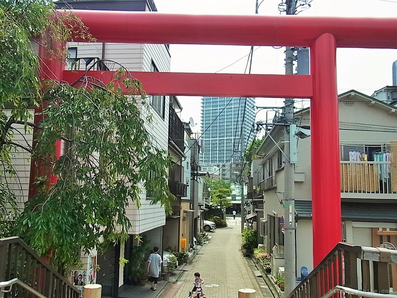 神社の鳥居。住民の小さい子が三輪車で遊んでいます。いいなあ、のどかだ。
