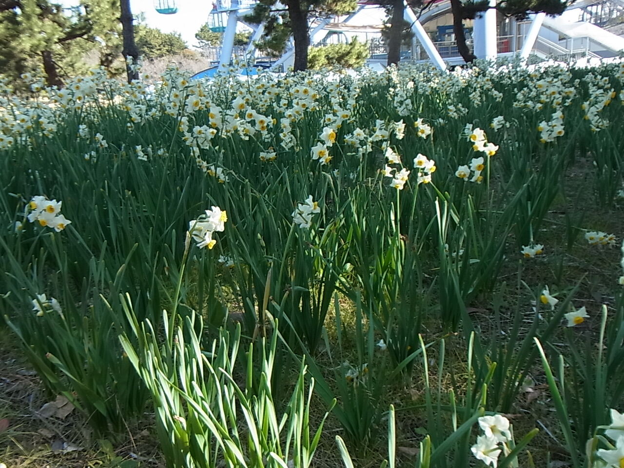 観覧車の下付近に水仙が植えられています。鋸南町からの寄付?もあるようです。日影のほうがきれいに咲いているようでした。水仙の開花時期は意外と長めで、日を変えて訪れてみてもまだあちこちで咲いていました。